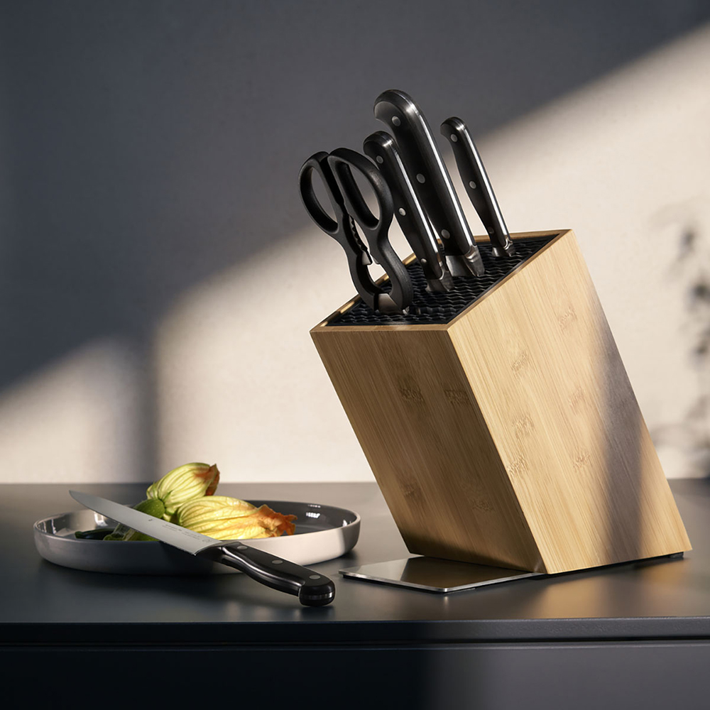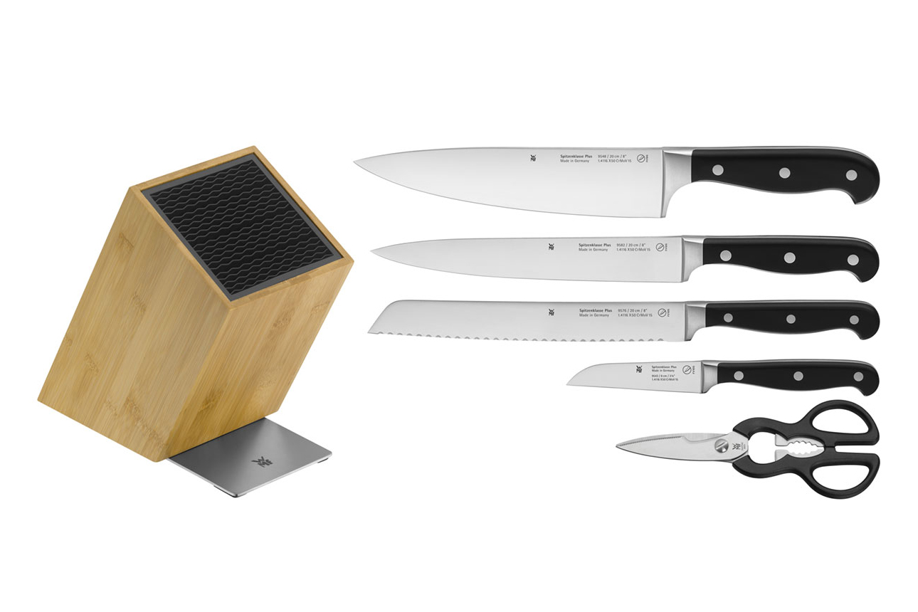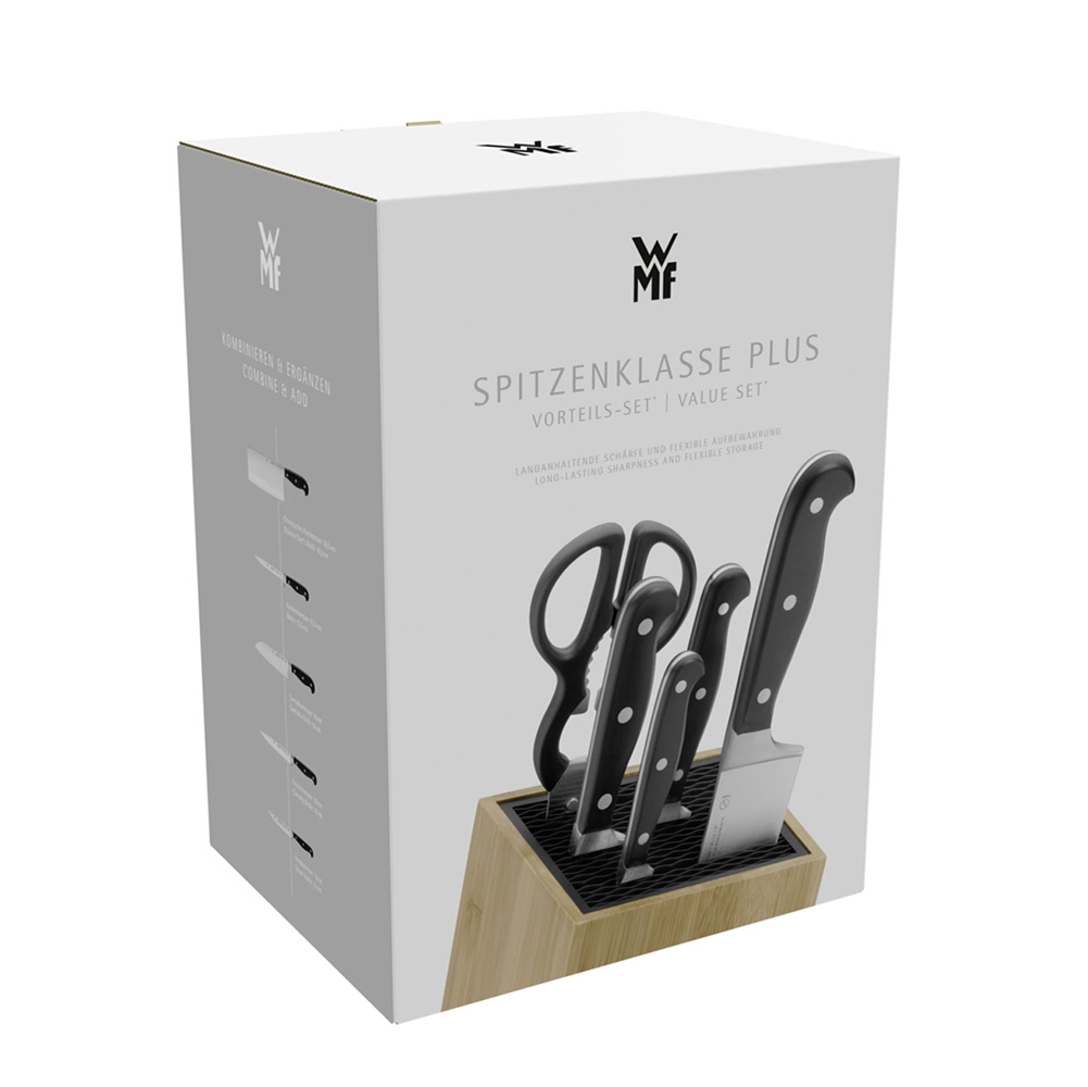 Набор кухонных ножей Spitzenklasse Plus – это качество, надежность, функциональность и оптимальная комплектация. Четыре самых необходимых ножа и кухонные ножницы станут незаменимыми помощниками на каждой кухне. Лезвие каждого ножа выполнено из кованой молибден-ванадиевой стали, которая обладает отличной прочностью и имеет высокую стойкость к коррозии. Эргономичная рукоять из высококачественного пластика с тремя заклепками – идеально гладкая. При изготовлении применяется технология Performance Cut: сочетание традиционных процессов ковки с современными методами заточки для долгого сохранения остроты лезвия. Набор укомплектован удобной и практичной подставкой FlexTec с инновационным дизайном. Новый блок FlexTec – идеальное решение для хранения ножей в доме. Он может вмещать до 15 ножей, поэтому вам не потребуется искать дополнительное место.