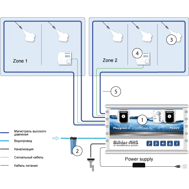 Система Playgreen 6 работает на 2 зоны увлажнения. В составе системы увлажнения может работать до 7 пассивных форсунок суммарно на 2 зоны увлажнения. Максимальная производительность центрального модуля составляет - 6л./час., суммарная площадь обслуживаемых помещений до 300 м2. Схема установки строится по кольцевой схеме, на каждую зону увлажнения выходит отдельная трубка высокого давления, далее труба проходит через форсунки и возвращается обратно в центральный блок. Открытие и закрытие клапанов происходит в центральном блоке, пассивные форсунки не имеют клапанов и работают только при наличии давления в магистрали. Команда на работу клапанов в центральном модуле исходит от пульта управления. При желании заказчика возможна установка максимальных гигростатов, для увеличения надёжности системы.
