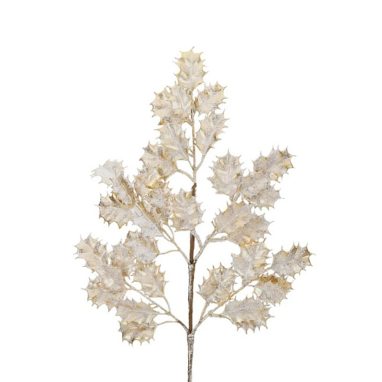 Ветка металическая из листьев падуба,перламутровый стебель,золото/белый 62 см